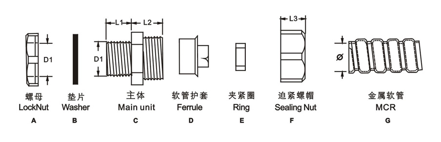 產(chǎn)品材質(zhì): A.C.F部位采用優(yōu)質(zhì)加厚型鋅合金制成、B.E部分采用丁腈橡膠制成、D為鐵皮制成。