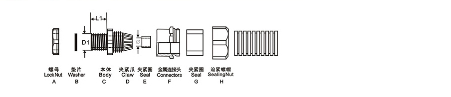 產(chǎn)品材質(zhì): A.C.F.G.部分采用優(yōu)良的黃銅鍍鎳制成,D部分采用UL認可之尼龍Pa66制成,
