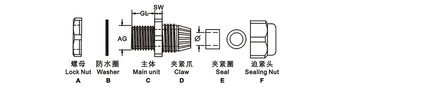 特殊夾緊爪與密封件相扣之設(shè)計,配合迫緊頭裝配省時便利,夾緊電纜范圍大,抗拉力特強(qiáng),可防水、防塵、防鹽、耐酸堿、酒精、油、脂及一般溶劑。